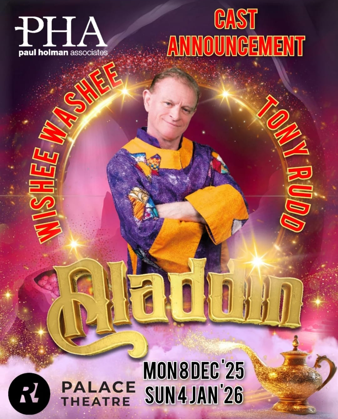 In the upcoming 2025/2026 season, Tony returns to Redditch to play the lovable Wishee Washee alongside Bill Ward and Dave Benson Phillips. You can catch them in the Palace Theatre’s production of Aladdin, running from Monday, 8th December 2025, to Sunday, 4th January 2026.